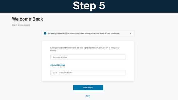 If no email address is selected, you can log in by entering your Account Number and the last four digits of your Social Security Number, TIN, SIN or PIN.